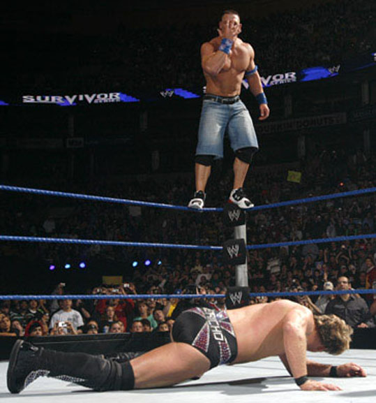 Cena charges at Jericho in the corner, but Jericho gets an elbow up and Cena falls back. Jericho pulls Cena up onto the top turnbuckle with him. Jericho lands a big right hand and headbutts on Cena. Cena fights back with some lefts and tosses Jericho off the top to the mat below. Cena stands up tall on the turnbuckle, jumps and connects with a big leg drop.