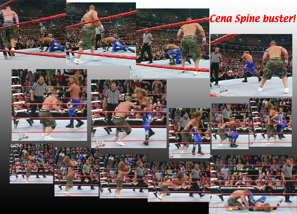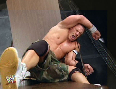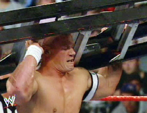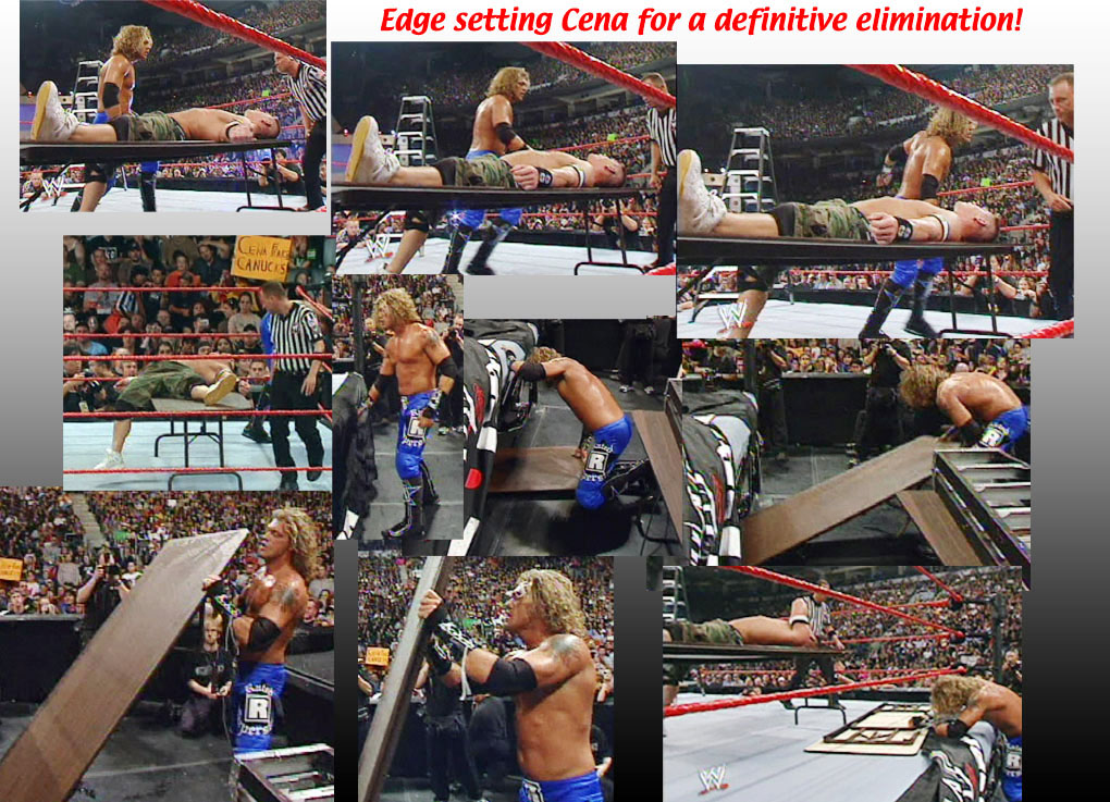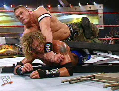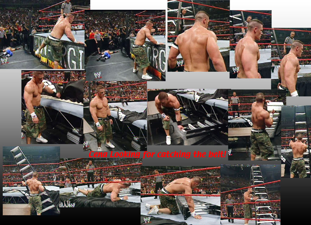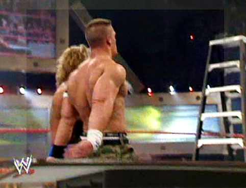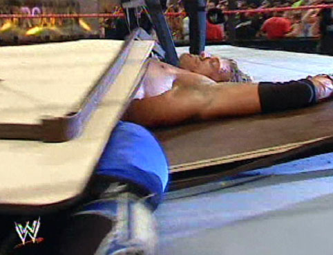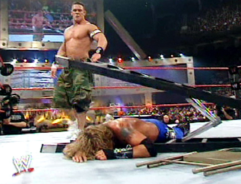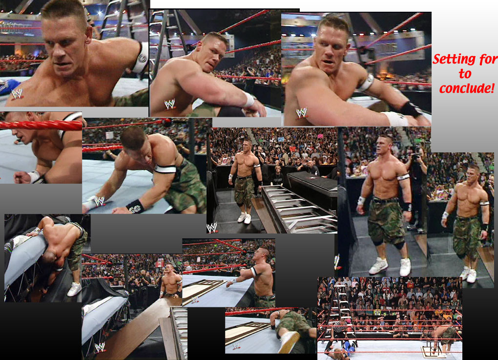 Cena climbed up it, but Lita came out and tipped it over sending Cena over the top rope through a table... |