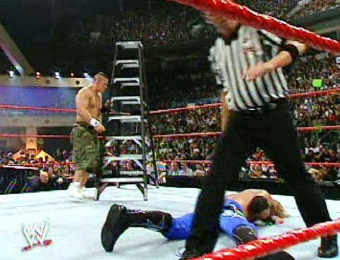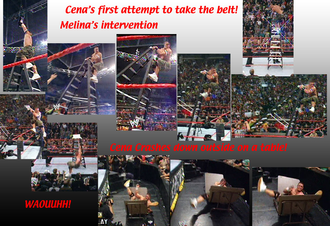 ... However, Lita's interference this time would backfire. As Edge then came in and started climbing up the ladder and Cena rolled back in trying to stop him, Lita hit Cena in the back with a chair shot. Cena fell forward into the ladder, sending Edge crashing off the ladder over the top rope and through yet another table. and Lita looked on horrified as she surveyed the wreckage. Cena then hit Lita with an FU that many would feel was well-deserved...