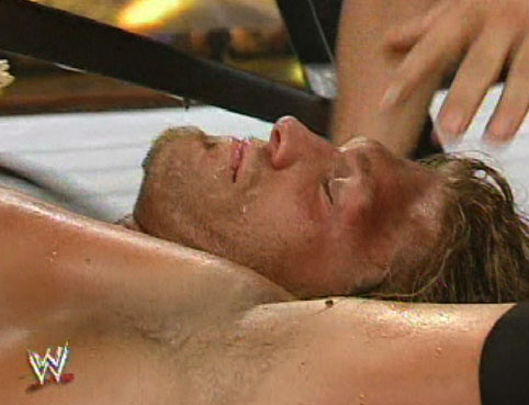 The Rated-R Superstar lying crumpled in a mess of wooden wreckage...