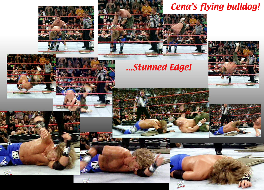 Edge with a fly bomb crushes hard John Cena into the mat!