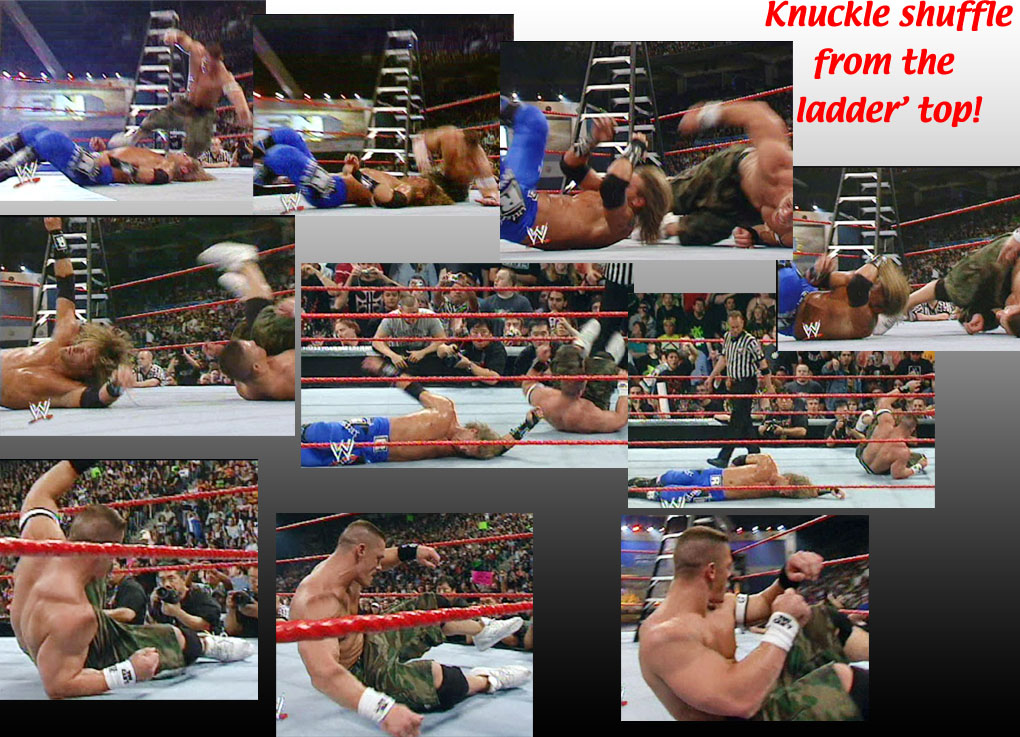 LITA'S INVOLVEMENT ...After both men had severely brutalized each other, Edge's female partner Lita would stick her nose in at an opportune time. Cena had an opportunity to climb for the championship, but just as he was about to grab the gold, Lita ran to the ring and tipped the ladder over, sending Cena crashing over 15 feet down through a table at ringside. .. |