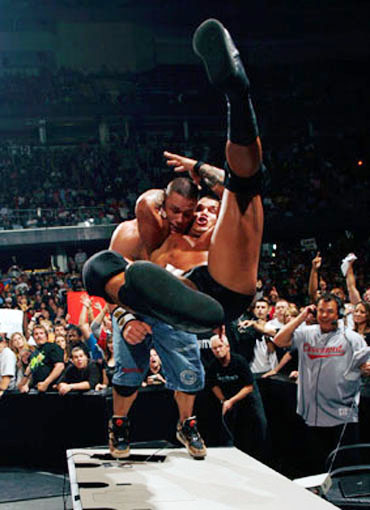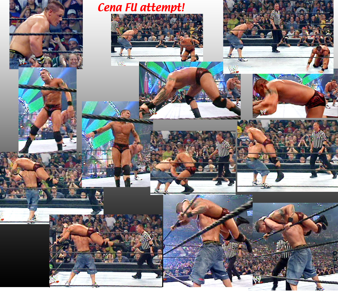 A FU ATTEMPT Cena loaded a still dazed Orton on his shoulders but in the move he couldn't avoid Randy Orton to catch the ropes, put off balance the FU, flip out off the FU over the ropes... |