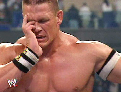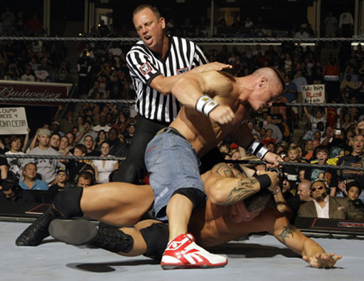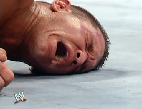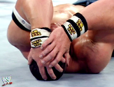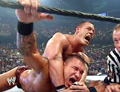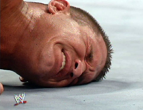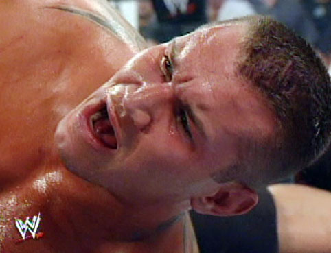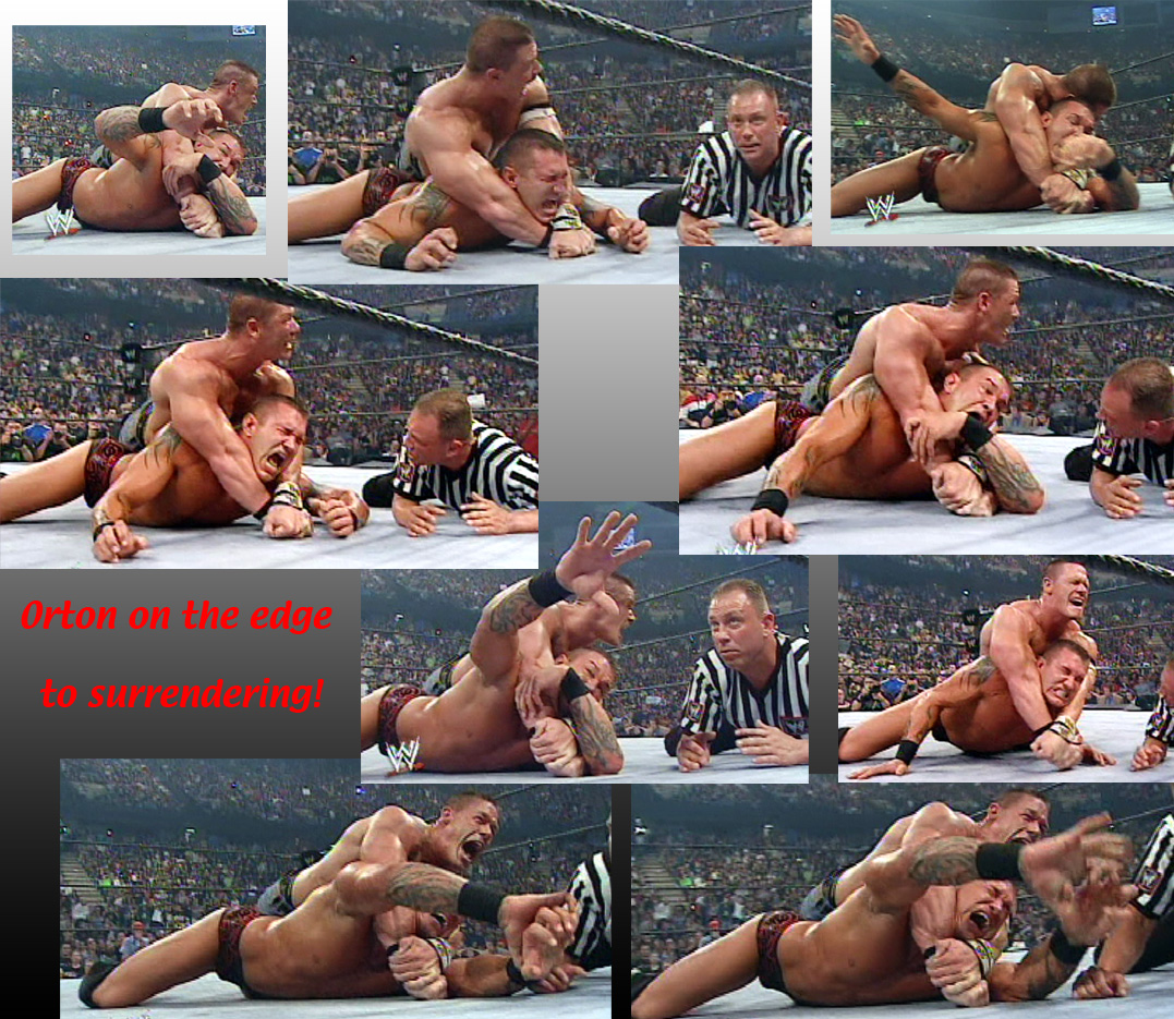 John Cena weakened by the beating he received from Randy Orton has been unable to force Orton to quit in his STFU! And John Cena felt very frustrated about that! |