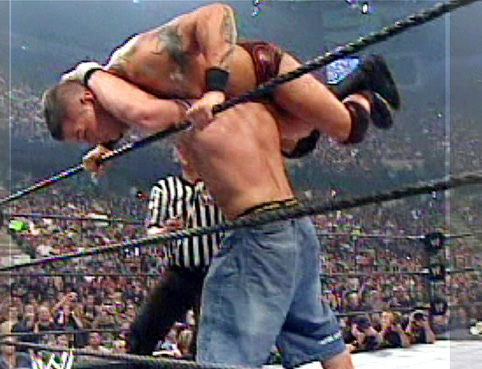 ...Suddenly, John Cena in a last desperate move slid his right arm under Orton's crotch and hoisted him on his shoulders in a perfect FU!... |