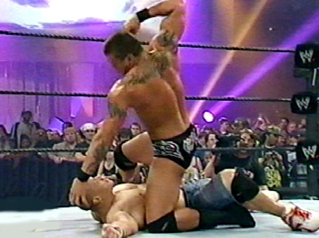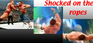 RANDY ORTON TURNING ONCE MORE THE TABLE ON CENA! ... In the same move caching John Cena back of the head with his left hand, he let his 248lbs body dropped down dragging down Cena's head brutally on the top rope! On the impact John Cena bounced backwards and fell back on mat stunned rubbing his painful head with both hands... |