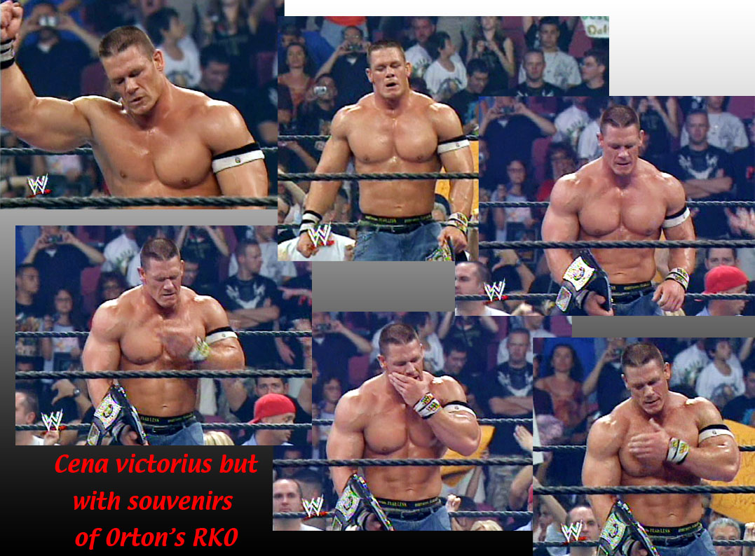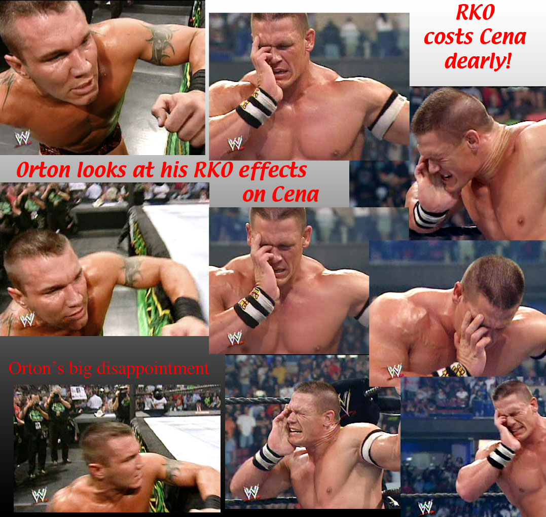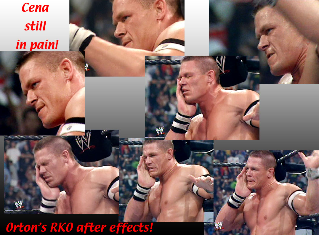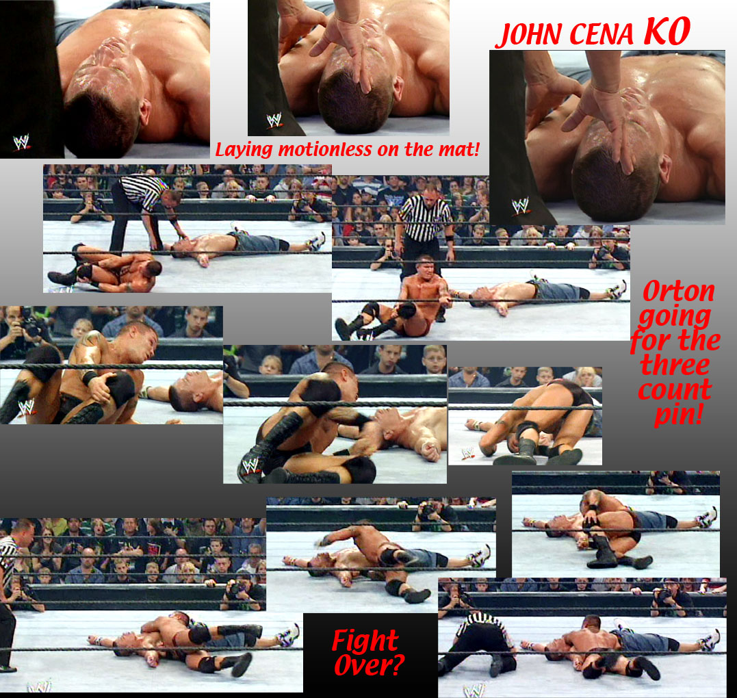 Orton fully aware that Cena was still suffering from the effects of the RKOs, had targeted his head and neck repeatedly with headlocks and skull-crushing fists. His powerful blows to the head have made Cena stumbling around the ring and appearing disoriented, the Champ's eyes at times glazed... Pinning many times under his body a John Cena he had stunned to death, Orton had thought at several point during the match that Cena's championship reign was over .The last Cena's escape after the RKO was something of a miracle!