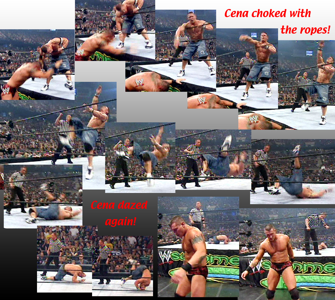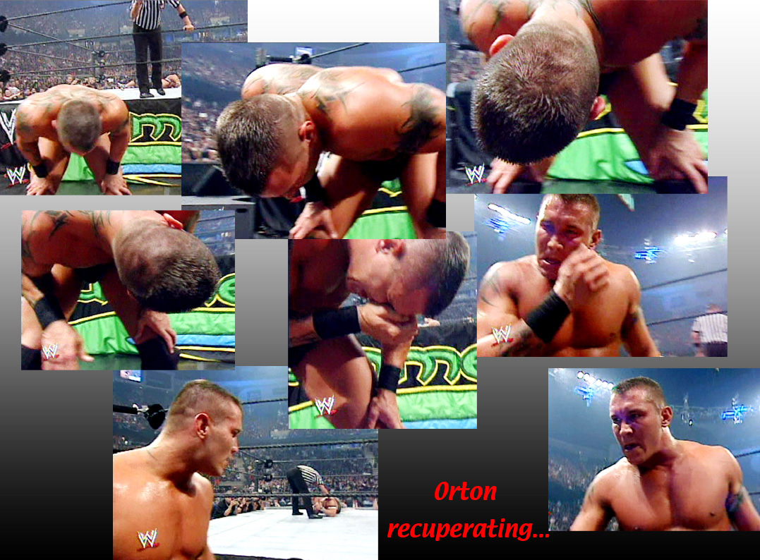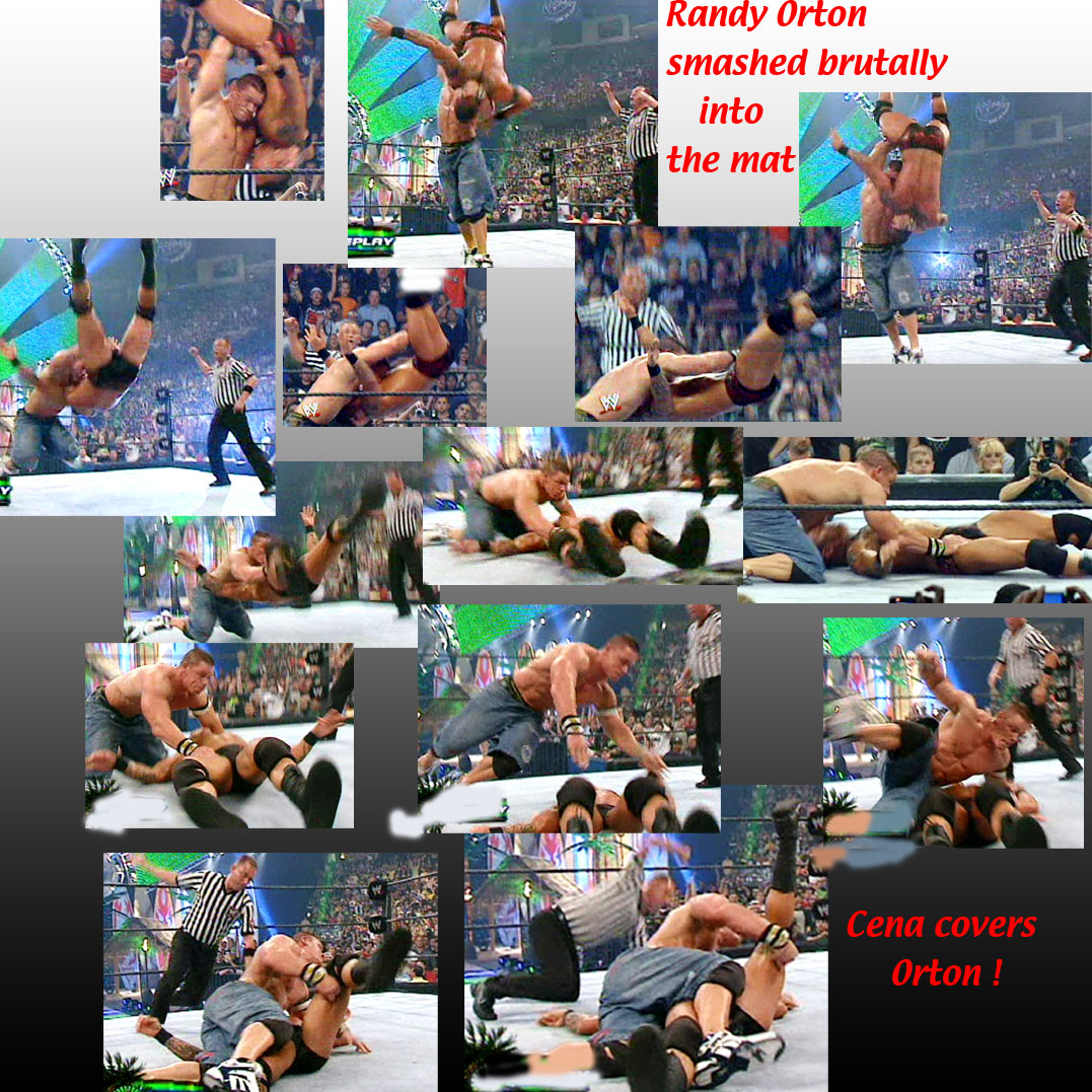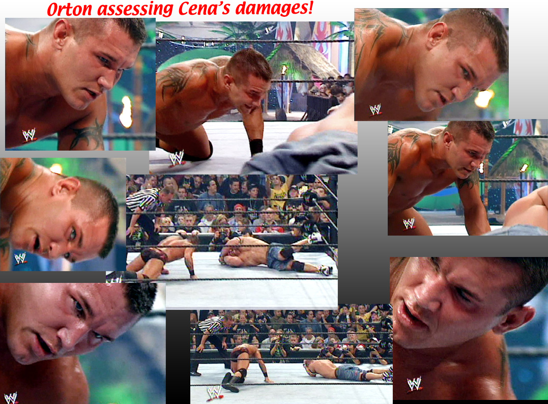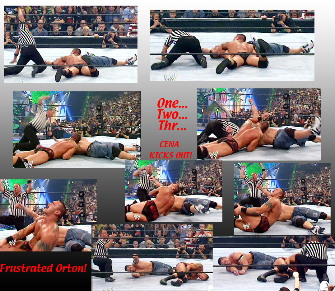 Orton fully aware that Cena was still suffering from the effects of the RKOs, had targeted his head and neck repeatedly with headlocks and skull-crushing fists. His powerful blows to the head have made Cena stumbling around the ring and appearing disoriented, the Champ's eyes at times glazed... Pinning many times under his body a John Cena he had stunned to death, Orton had thought at several point during the match that Cena's championship reign was over .The last Cena's escape after the RKO was something of a miracle!